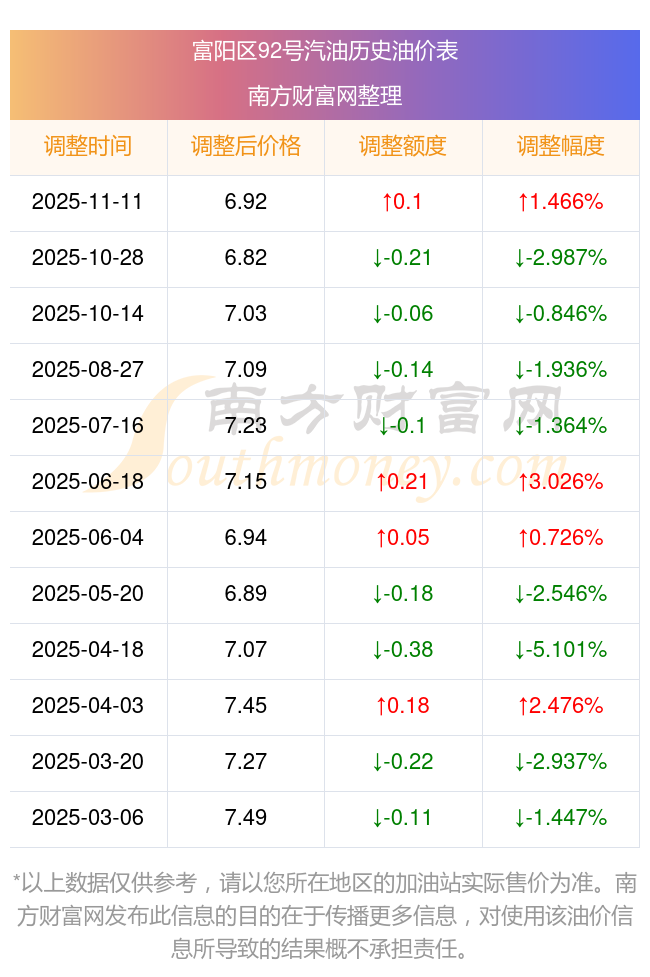 油價數(shù)據(jù)僅供參考,請以您所在地區(qū)的加油站報價為準(zhǔn)。南方財(cái)富網(wǎng)發(fā)布此信息的目的在于傳播更多信息,對使用該油價信息所導(dǎo)致的結(jié)果概不承擔(dān)任何責(zé)任。