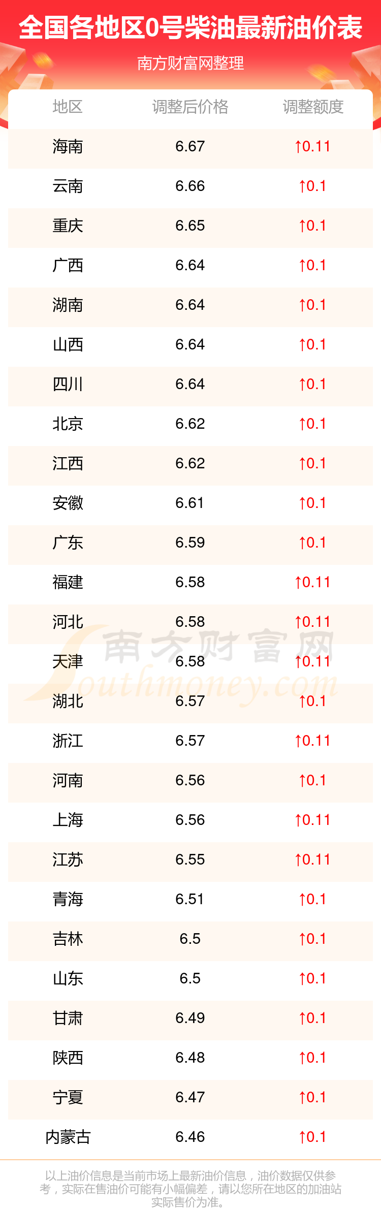 全國(guó)各地區(qū)最新0號(hào)柴油油價(jià)表
