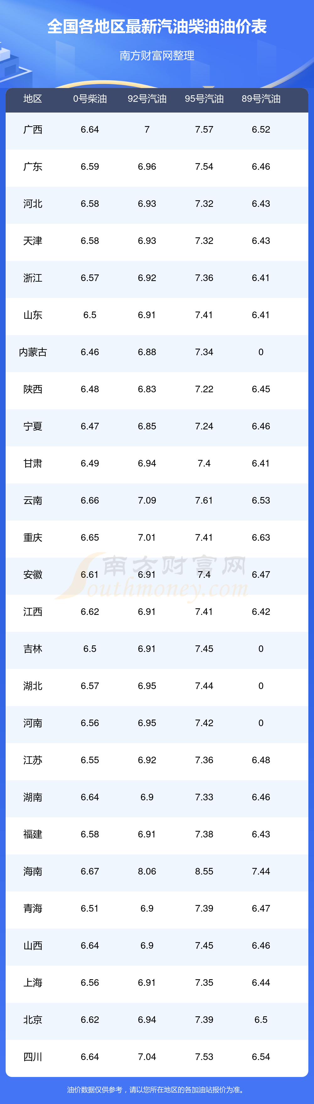 以上數(shù)據(jù)僅供參考,請以您所在地區(qū)的加油站實際售價為準。南方財富網(wǎng)發(fā)布此信息的目的在于傳播更多信息,對使用該油價信息所導致的結果概不承擔責任。