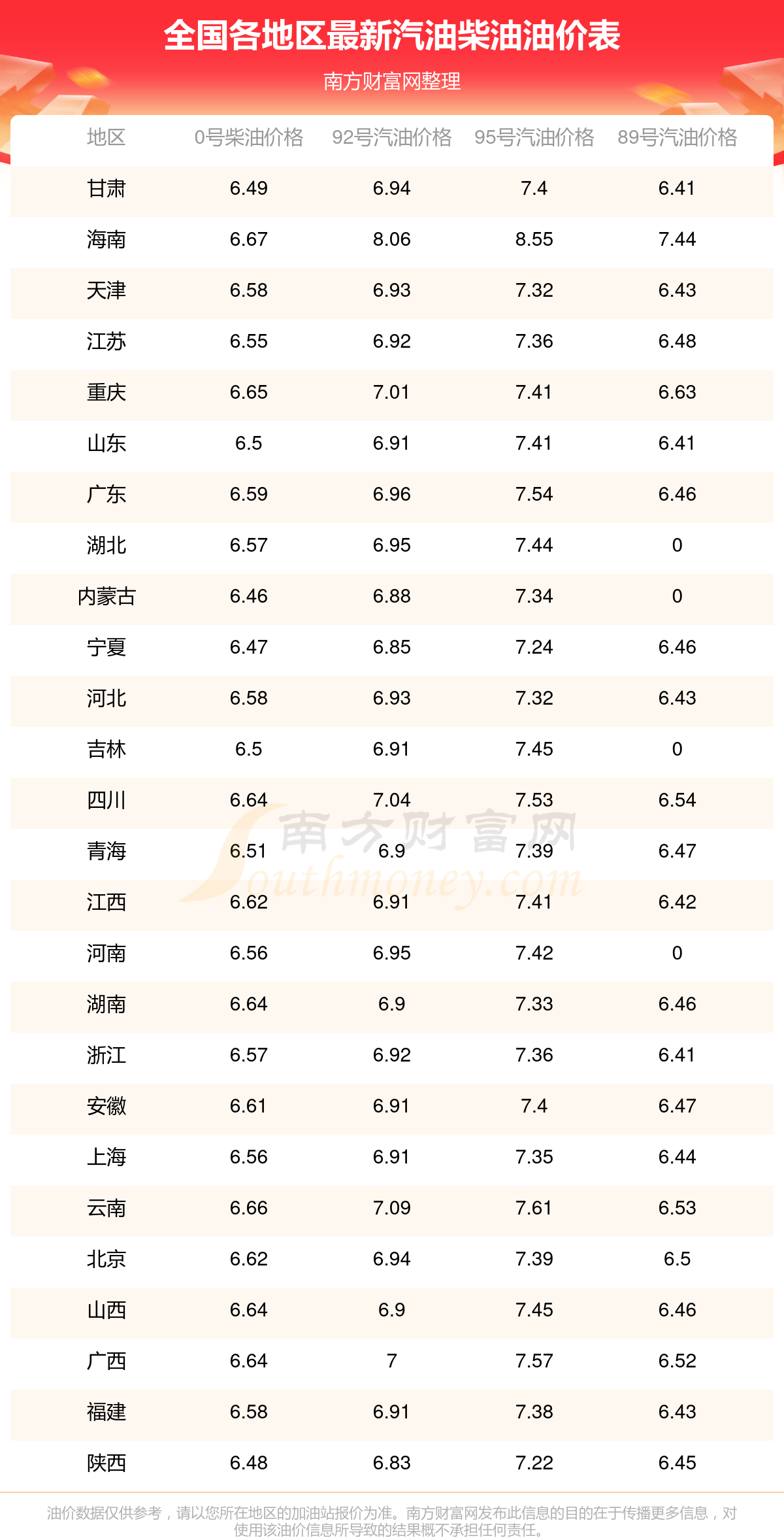 全國各地區(qū)2025年最新汽油價(jià)格表