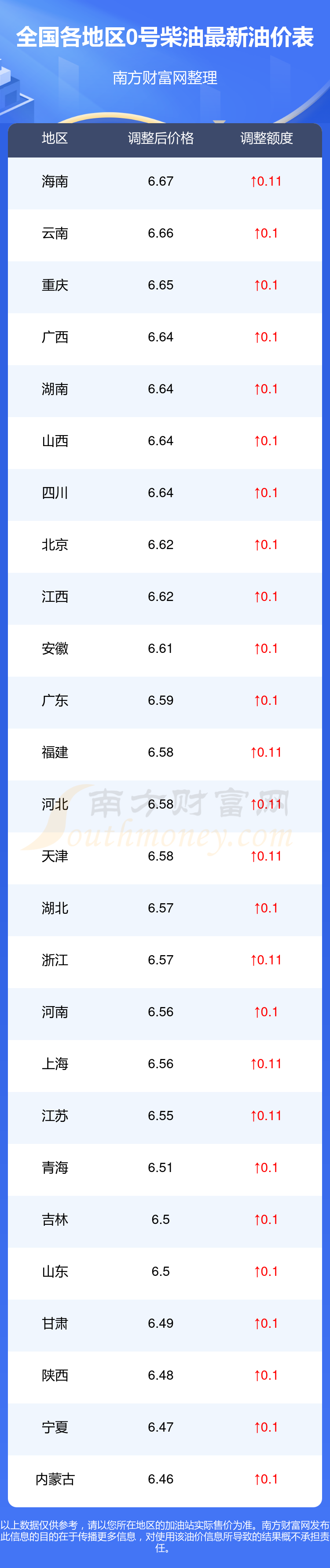 全國(guó)各地區(qū)最新0號(hào)柴油油價(jià)表