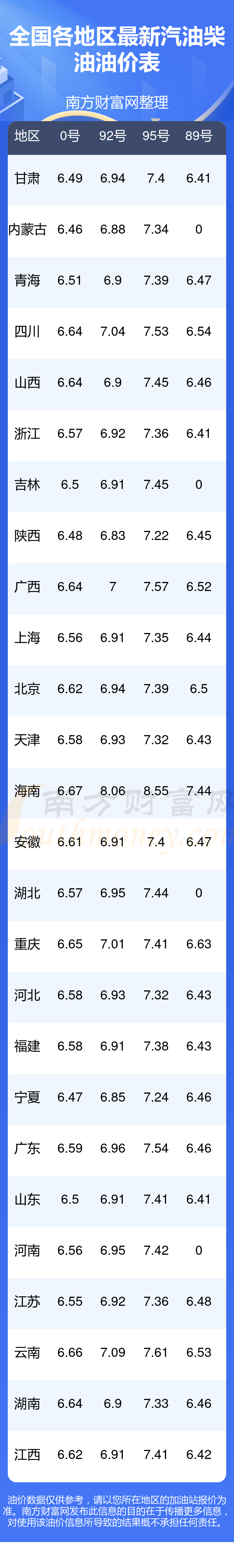 油價(jià)數(shù)據(jù)僅供參考,請(qǐng)以您所在地區(qū)的加油站報(bào)價(jià)為準(zhǔn)。南方財(cái)富網(wǎng)發(fā)布此信息的目的在于傳播更多信息,對(duì)使用該油價(jià)信息所導(dǎo)致的結(jié)果概不承擔(dān)任何責(zé)任。