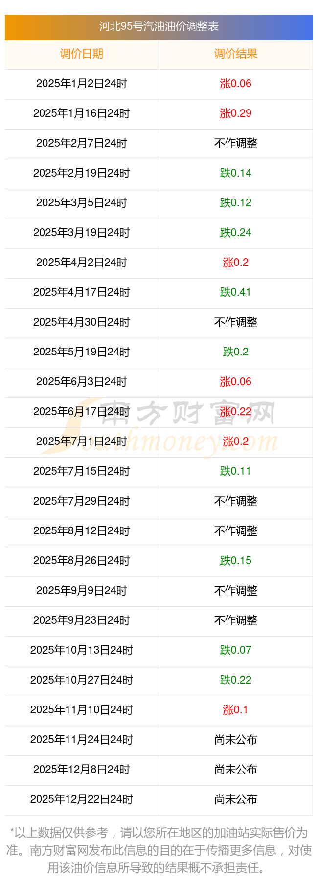 11月16日,河北95號汽油的價格是7.32元每升,本次的調(diào)整時間為11月11日,對比上次的調(diào)整上漲了0.1元,上漲1.385%,下次調(diào)整時間為11月24日24時,還有8.57天。