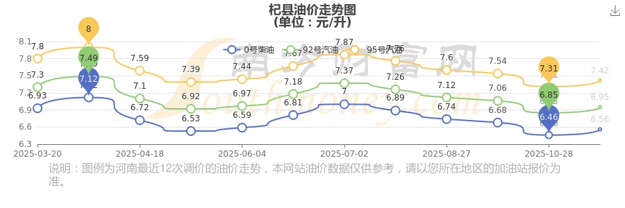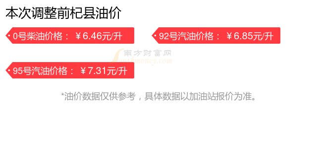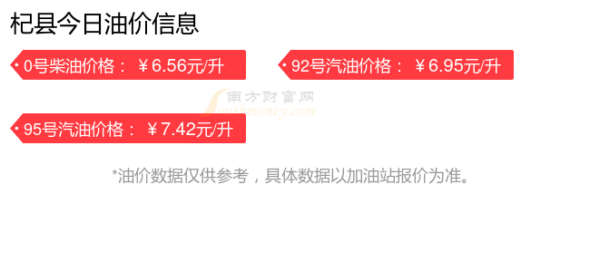 11月16日杞縣汽油、柴油每升的價(jià)格為:92號汽油為6.95元,漲了0.1元;95號汽油為7.42元,漲了0.11元;0號柴油為6.56元,漲了0.1元,本輪油價(jià)的調(diào)整時(shí)間為11月11日。