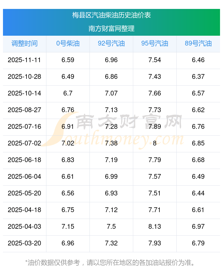 梅縣區(qū)汽油、柴油11月16日每升的價(jià)格為11月11日調(diào)整后的價(jià)格,具體油價(jià)為:92號(hào)汽油6.96元;95號(hào)汽油7.54元;89號(hào)汽油6.46元;0號(hào)柴油6.59元。