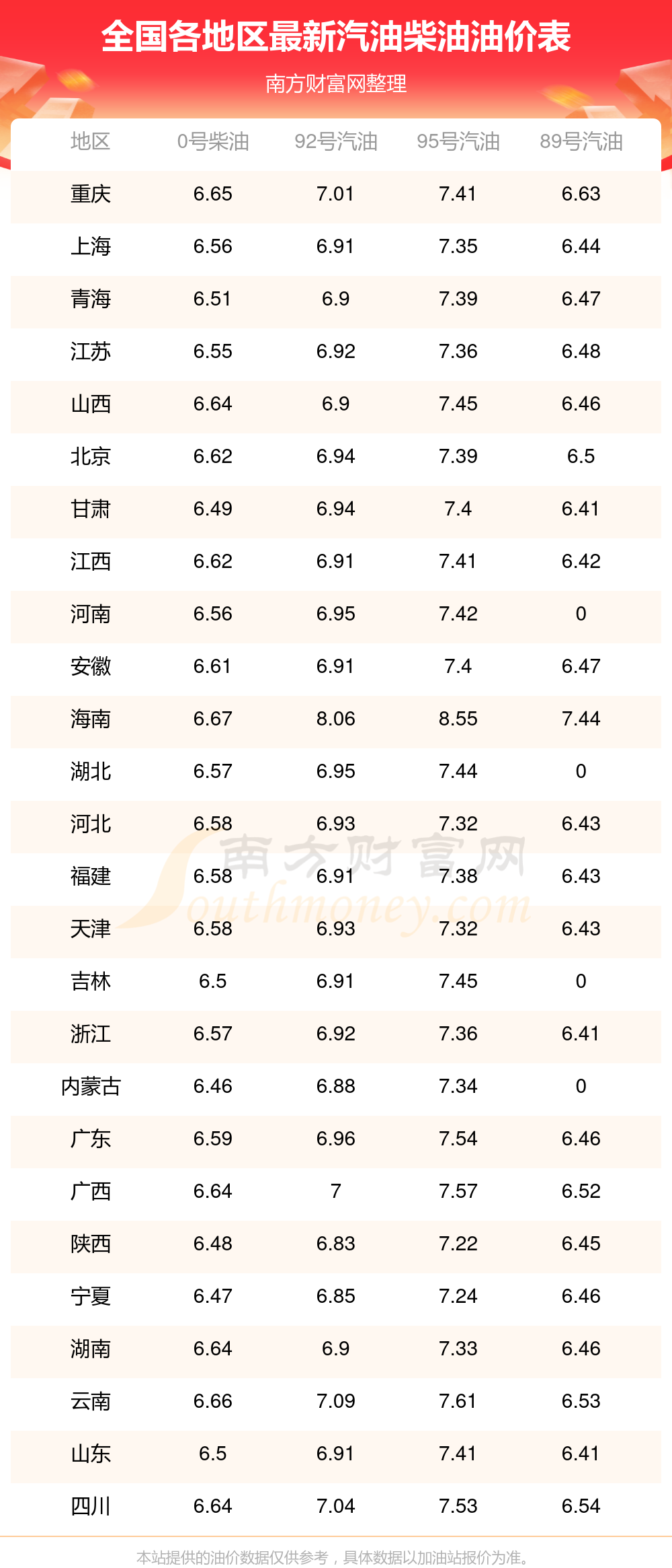 附:最新全國汽油、柴油價格一覽表