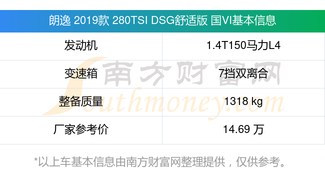 在動力上,朗逸 2019款 280TSI DSG舒適版 國VI配備的是一臺1.4T150馬力L4渦輪增壓發(fā)動機,匹配的是7擋雙離合自動檔變速箱,燃料形式為汽油,常規(guī)整備質(zhì)量1318kg,廠家參考價14.69萬元。