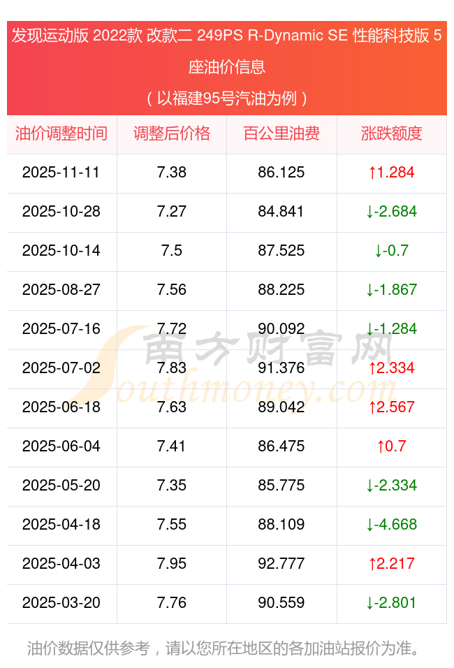 按11月11日95號汽油最新調(diào)整價格7.38元每升來計算(以福建為例),該車型百公里平均油費為86.125元,按上一輪10月28日調(diào)整價格7.27元每升來計算,百公里平均油費為84.841元,對比上一輪多花1.284元,下一輪油價調(diào)整時間為11月24日24時。