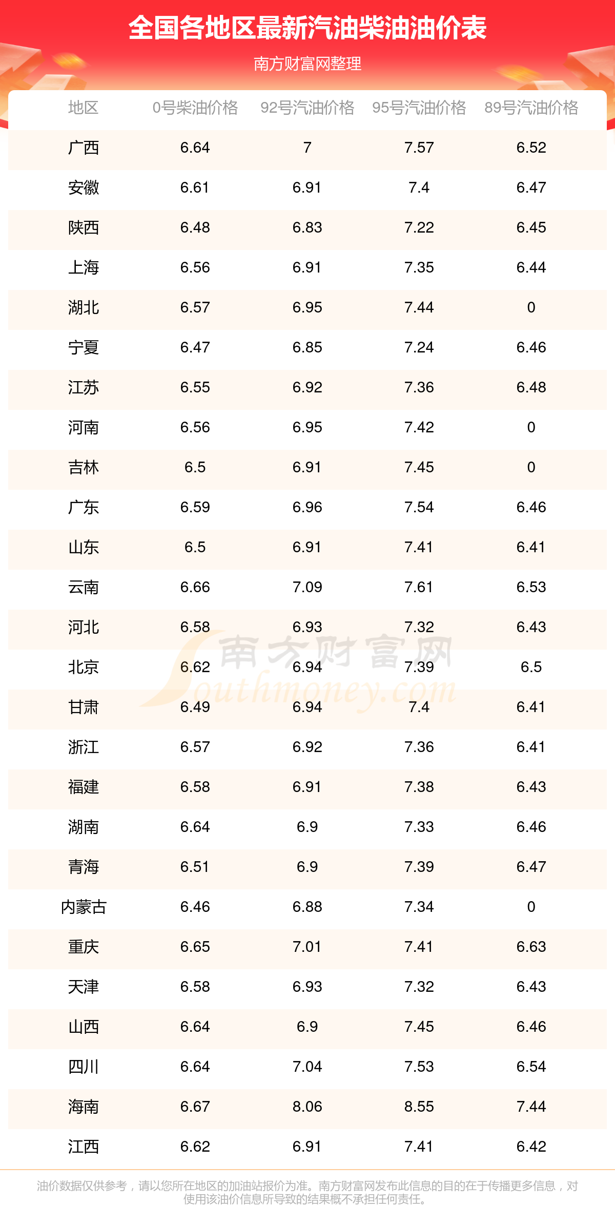 2025年全國(guó)各地區(qū)最新油價(jià)表