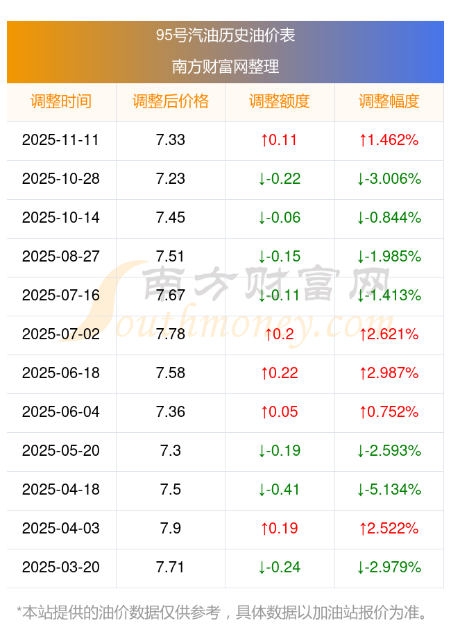 11月16日,汽油、柴油每升的價(jià)格是多少?11月11日油價(jià)調(diào)整后,92號(hào)汽油為6.9元,升了0.1元,升幅達(dá)1.46%;95號(hào)汽油為7.33元,升了0.11元,升幅達(dá)1.46%;89號(hào)汽油為6.46元,升了0.09元,升幅達(dá)1.46%;0號(hào)柴油為6.64元,升了0.1元,升幅達(dá)1.58%。下一輪油價(jià)調(diào)整時(shí)間11月24日24時(shí),距離現(xiàn)在還有8.54天。
