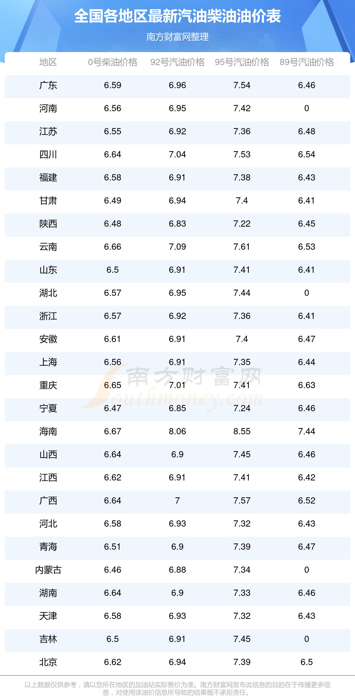 油價(jià)數(shù)據(jù)僅供參考,請(qǐng)以您所在地區(qū)的加油站報(bào)價(jià)為準(zhǔn)。南方財(cái)富網(wǎng)發(fā)布此信息的目的在于傳播更多信息,對(duì)使用該油價(jià)信息所導(dǎo)致的結(jié)果概不承擔(dān)任何責(zé)任。
