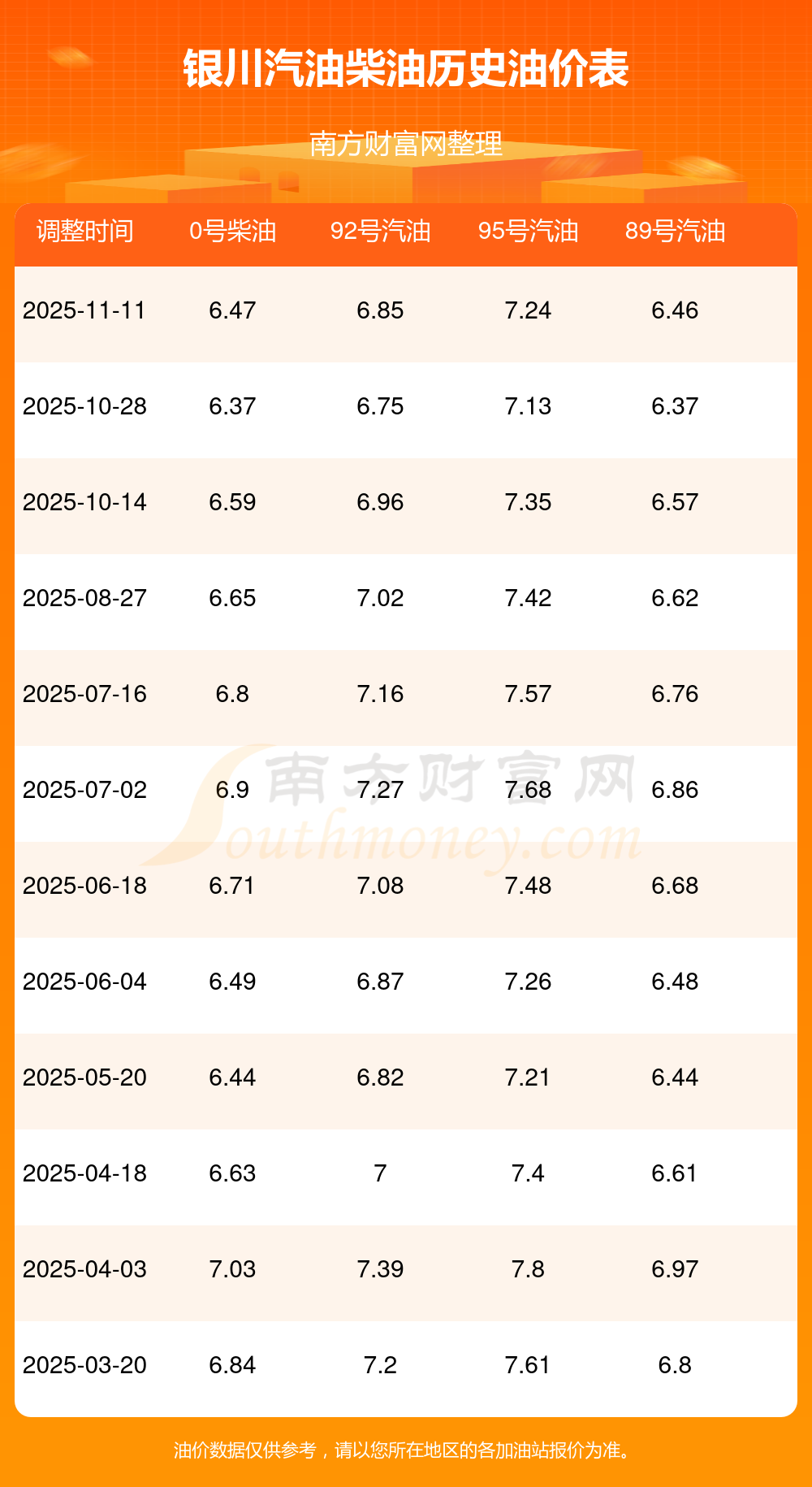 銀川汽油、柴油11月16日每升的價格為(本輪油價調(diào)整時間為11月11日):92號汽油6.85元;95號汽油7.24元;89號汽油6.46元;0號柴油6.47元。