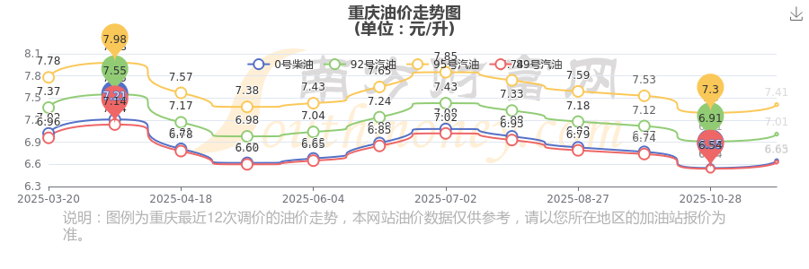 重慶汽油、柴油11月16日每升的價(jià)格為11月11日調(diào)整后的價(jià)格:92號(hào)汽油7.01元;95號(hào)汽油7.41元;89號(hào)汽油6.63元;0號(hào)柴油6.65元。