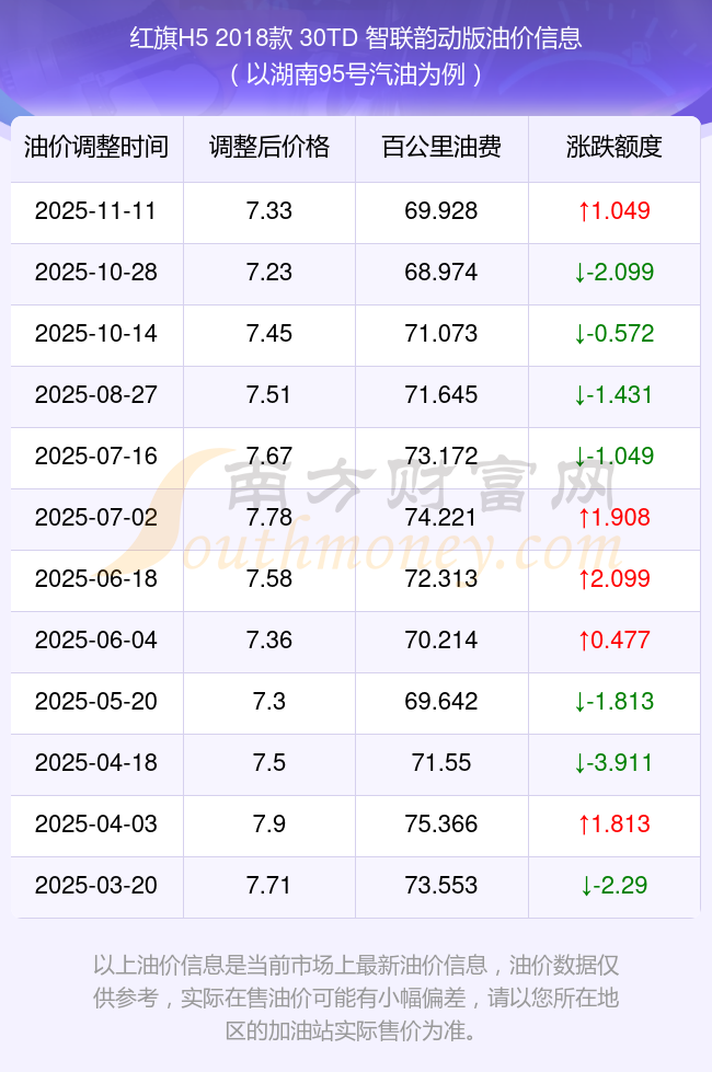 按照11月11日95號(hào)汽油最新調(diào)整價(jià)格7.33元/升來(lái)計(jì)算(以湖南為例),該車(chē)型百公里平均油費(fèi)為69.928元,按照上一輪10月28日調(diào)整價(jià)格7.23元/升來(lái)計(jì)算,百公里平均油費(fèi)為68.974元,對(duì)比上一輪多花1.049元,下一輪油價(jià)調(diào)整時(shí)間為11月24日24時(shí)。