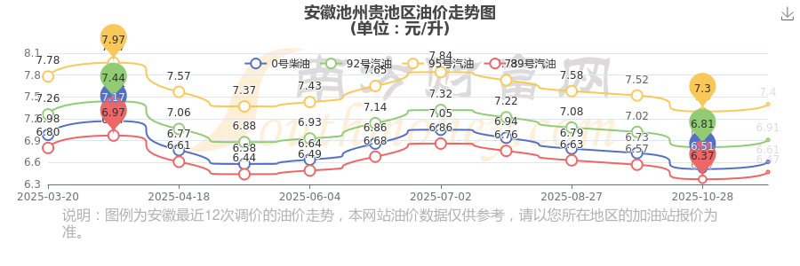 11月16日安徽池州貴池區(qū)汽油柴油每升的價格為11月11日調(diào)整后的價格,具體如下:92號汽油6.91元;95號汽油7.4元;89號汽油6.47元;0號柴油6.61元。