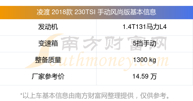 凌渡 2018款 230TSI 手動(dòng)風(fēng)尚版動(dòng)力方面,搭載的是一臺(tái)1.4T131馬力L4渦輪增壓發(fā)動(dòng)機(jī),匹配5擋手動(dòng)擋變速箱,燃料形式為汽油,常規(guī)整備質(zhì)量1300kg,廠家參考價(jià)14.59萬(wàn)元。