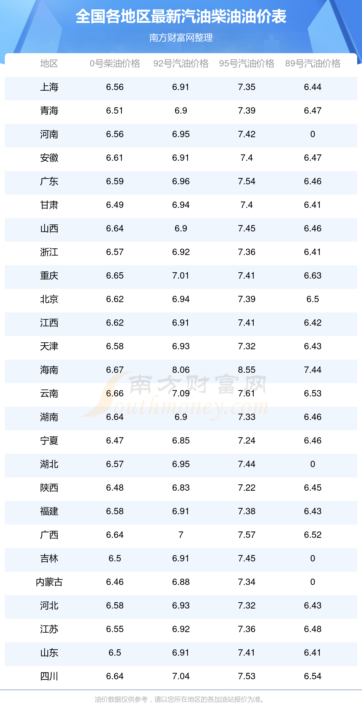油價數(shù)據(jù)僅供參考,請以您所在地區(qū)的加油站報價為準(zhǔn)。南方財富網(wǎng)發(fā)布此信息的目的在于傳播更多信息,對使用該油價信息所導(dǎo)致的結(jié)果概不承擔(dān)任何責(zé)任。
