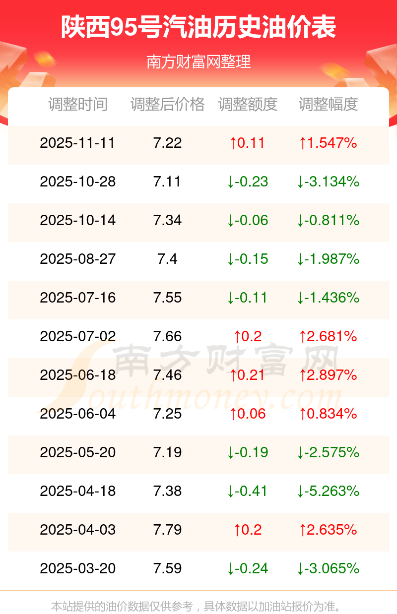 11月16日陜西95號(hào)汽油價(jià)格是11月11日調(diào)整后的價(jià)格,為7.22元每升,相對(duì)上一輪調(diào)整時(shí)間10月28日的油價(jià)7.11元/升,上調(diào)了0.11元。