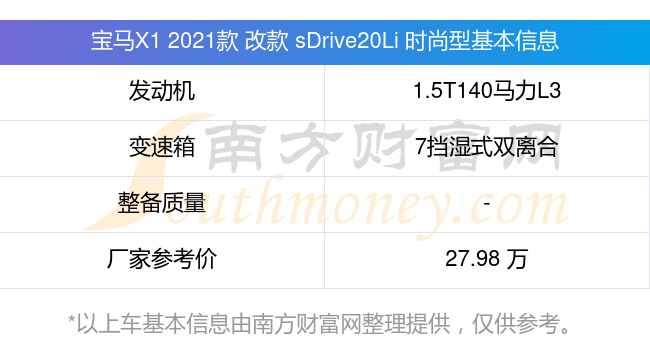 寶馬X1 2021款 改款 sDrive20Li 時(shí)尚型動(dòng)力上配備的是一臺(tái)1.5T140馬力L3渦輪增壓發(fā)動(dòng)機(jī),匹配的是7擋濕式雙離合自動(dòng)檔變速箱,燃料形式為汽油,廠家參考價(jià)27.98萬元。