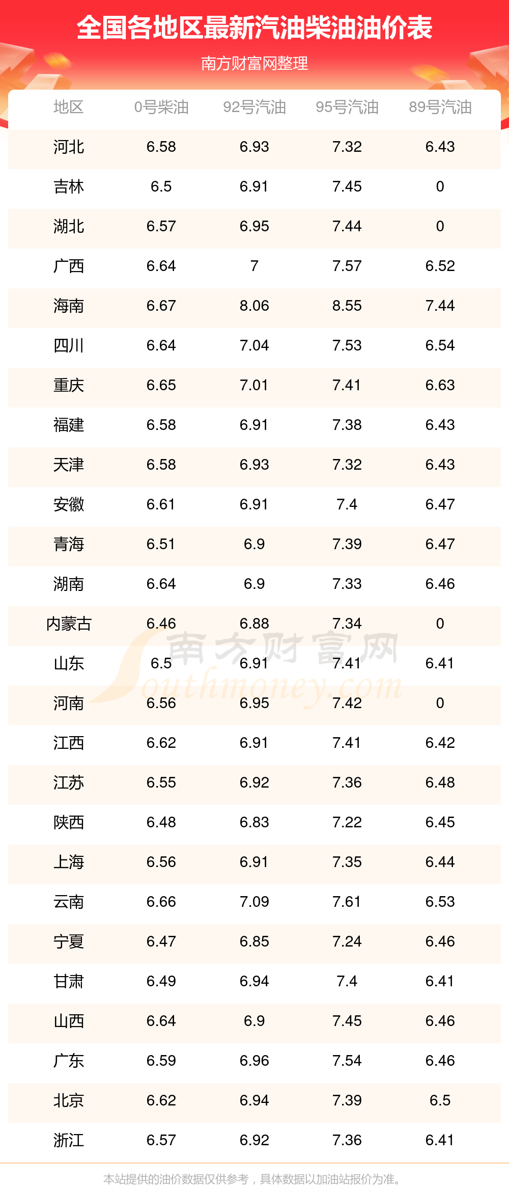 油價(jià)數(shù)據(jù)僅供參考,請(qǐng)以您所在地區(qū)的加油站報(bào)價(jià)為準(zhǔn)。南方財(cái)富網(wǎng)發(fā)布此信息的目的在于傳播更多信息,對(duì)使用該油價(jià)信息所導(dǎo)致的結(jié)果概不承擔(dān)任何責(zé)任。