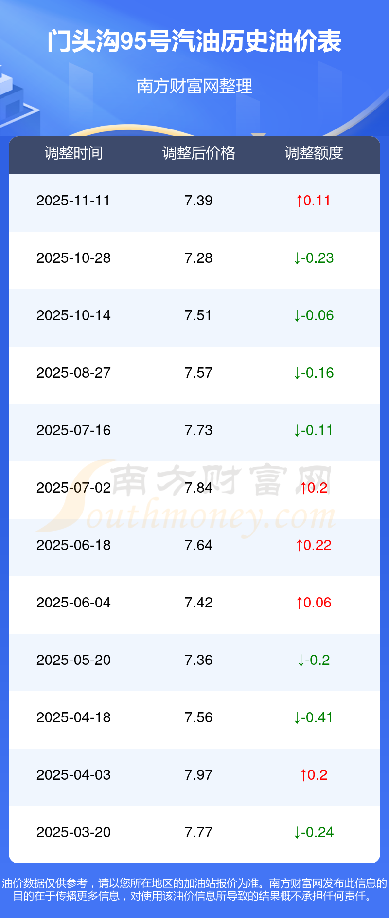 2025年95號(hào)汽油價(jià)格調(diào)整一覽表