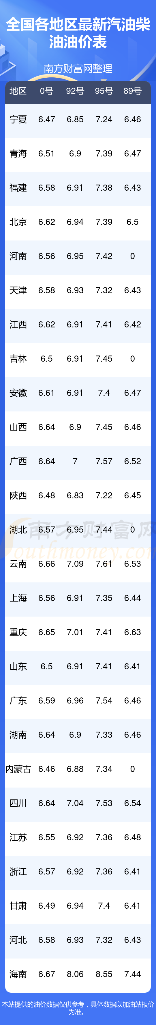 0號(hào)柴油平均價(jià)格:7元每升,其中,最高為海南,價(jià)格為6.67元/升,最低為內(nèi)蒙古,價(jià)格為6.46元/升。