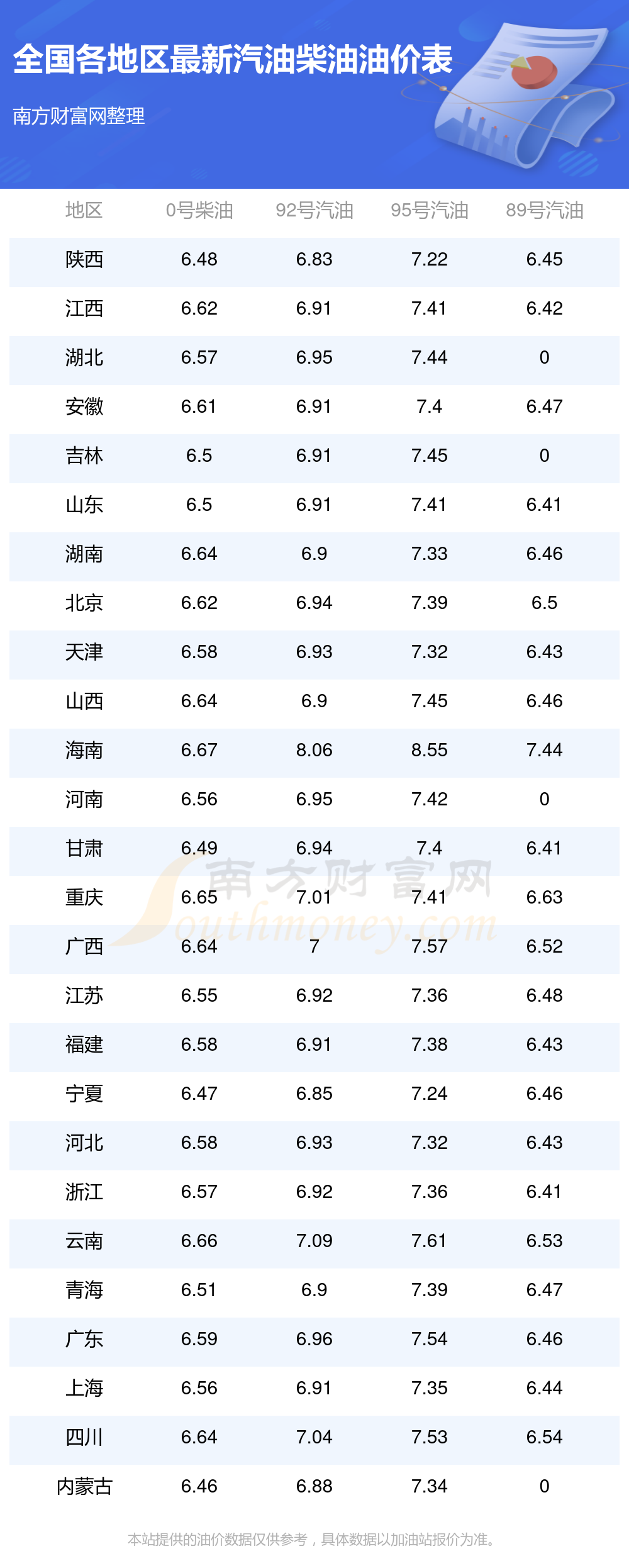 0號柴油平均價格:7元每升,其中,最高為海南,價格6.67元/升,最低為內(nèi)蒙古,價格6.46元/升。