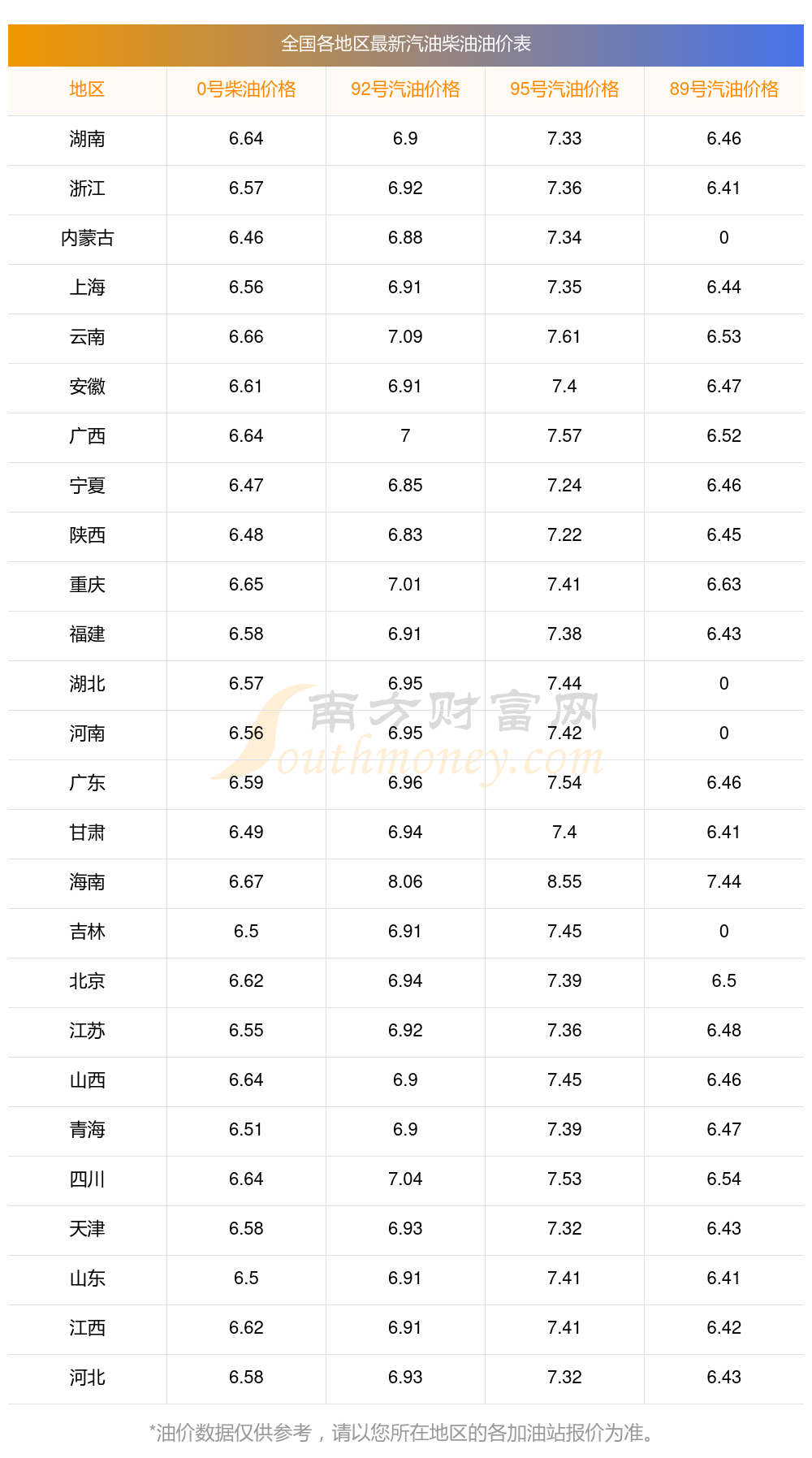 全國(guó)各地區(qū)最新汽油價(jià)格表
