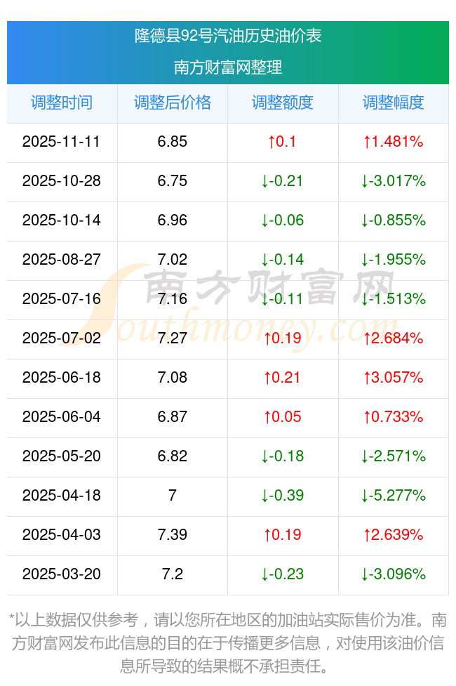 隆德縣92號汽油11月16日最新價格為6.85元每升,本輪油價調(diào)整時間為11月11日,相對上次調(diào)整時間10月28日的油價6.75元每升,共升了0.1元,升1.481%。