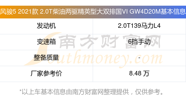風(fēng)駿5 2021款 2.0T柴油兩驅(qū)精英型大雙排國VI GW4D20M動(dòng)力方面,搭載的是一臺(tái)2.0T139馬力L4渦輪增壓發(fā)動(dòng)機(jī),匹配6擋手動(dòng)擋變速箱,燃料形式為柴油,廠家參考價(jià)8.48萬元。