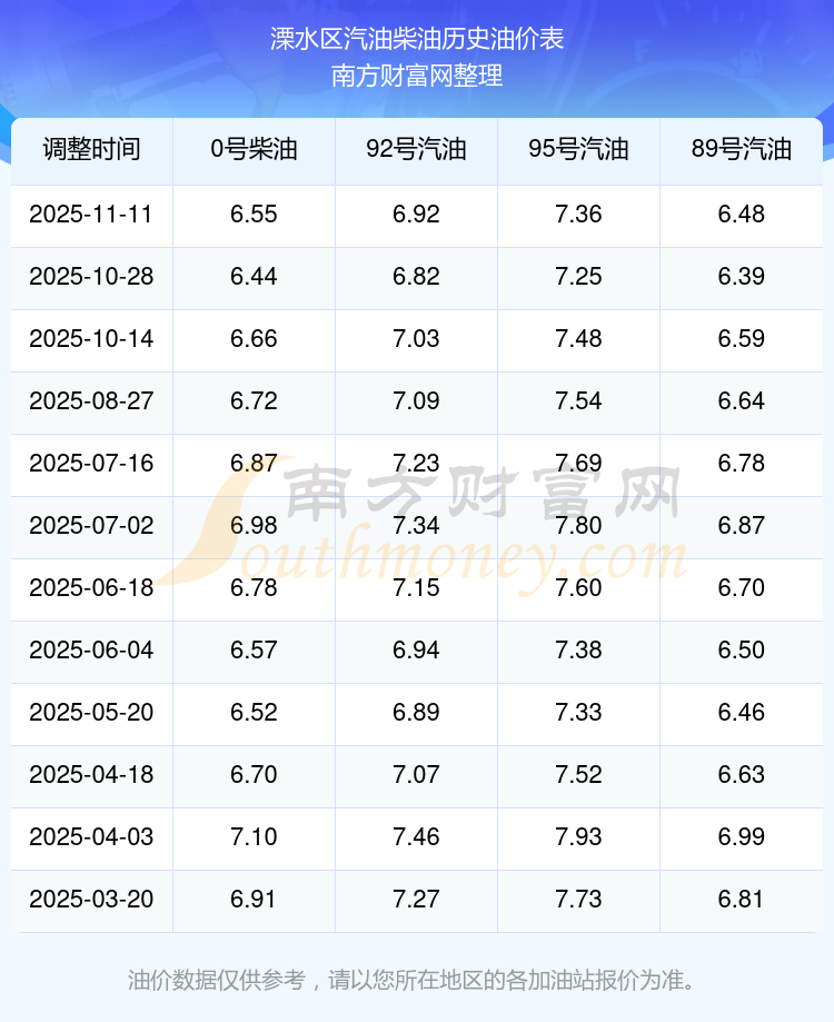 油價數(shù)據(jù)僅供參考,請以您所在地區(qū)的各加油站報價為準(zhǔn)。