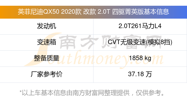 英菲尼迪QX50 2020款 改款 2.0T 四驅(qū)菁英版動(dòng)力上配備的是一臺(tái)2.0T261馬力L4渦輪增壓發(fā)動(dòng)機(jī),匹配的是CVT無級(jí)變速(模擬8擋)自動(dòng)檔變速箱,燃料形式為汽油,常規(guī)整備質(zhì)量1858kg,廠家參考價(jià)37.18萬元。