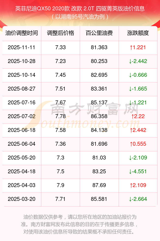 根據(jù)11月11日95號(hào)汽油最新調(diào)整價(jià)格7.33元/升來計(jì)算(以湖南為例),該車型每百公里的平均油費(fèi)是81.363元,上一輪10月28日調(diào)整價(jià)格7.23元每升來計(jì)算,每百公里的平均油費(fèi)是80.253元,對(duì)比上一輪多花1.221元,下一輪的油價(jià)調(diào)整時(shí)間是11月24日24時(shí)。