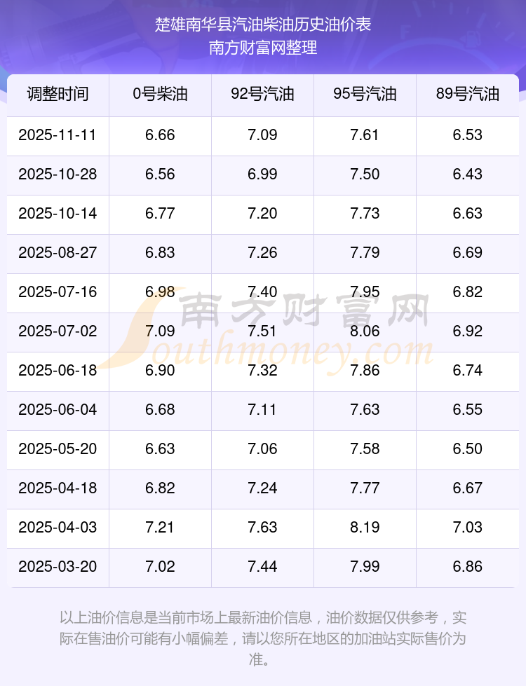 楚雄南華縣汽油、柴油11月16日每升最新價格為:95號汽油為7.61元,升了0.11元;92號汽油為7.09元,升了0.1元;89號汽油為6.53元,升了0.1元;0號柴油為6.66元,升了0.1元,調(diào)整時間為11月11日。