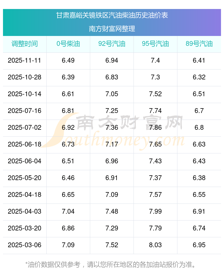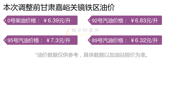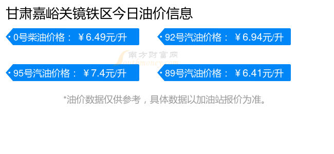甘肅嘉峪關(guān)鏡鐵區(qū)汽油、柴油11月16日每升的價格具體是(11月11日調(diào)整后的價格):92號汽油6.94元;95號汽油7.4元;89號汽油6.41元;0號柴油6.49元。