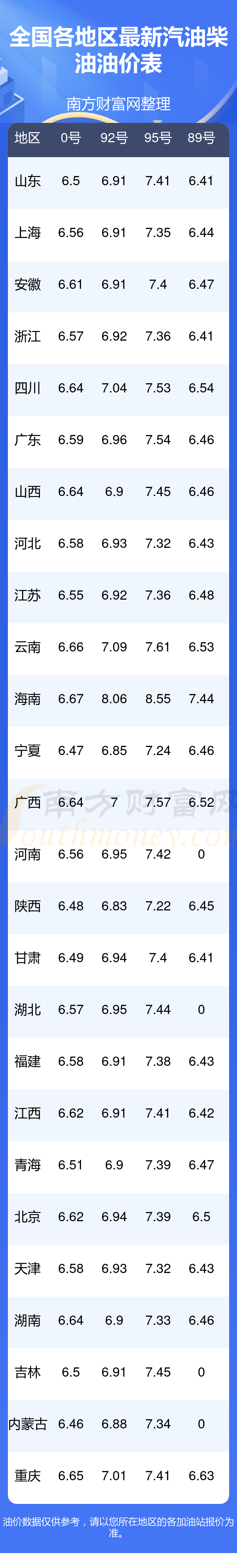 全國89號汽油最新平均價格為:7元每升,其中,最高為海南,價格為7.44元/升,最低為浙江,價格為6.41元/升。