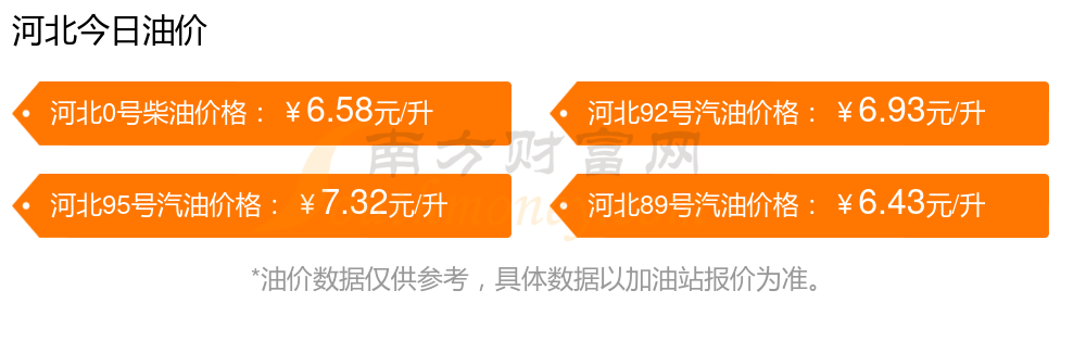 11月16日河北南宮汽油柴油每升的價(jià)格為11月11日調(diào)整后的價(jià)格,具體如下:92號(hào)汽油6.93元;95號(hào)汽油7.32元;89號(hào)汽油6.43元;0號(hào)柴油6.58元。