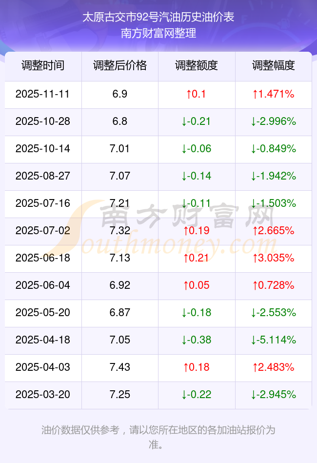 11月16日太原古交市92號汽油歷史油價(jià)調(diào)整一覽表