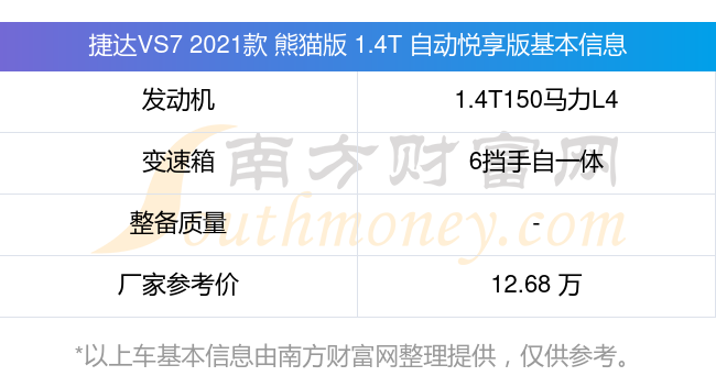 捷達(dá)VS7 2021款 熊貓版 1.4T 自動悅享版動力方面,搭載的是一臺1.4T150馬力L4渦輪增壓發(fā)動機(jī),匹配6擋手自一體自動檔變速箱,燃料形式為汽油,廠家參考價12.68萬元。