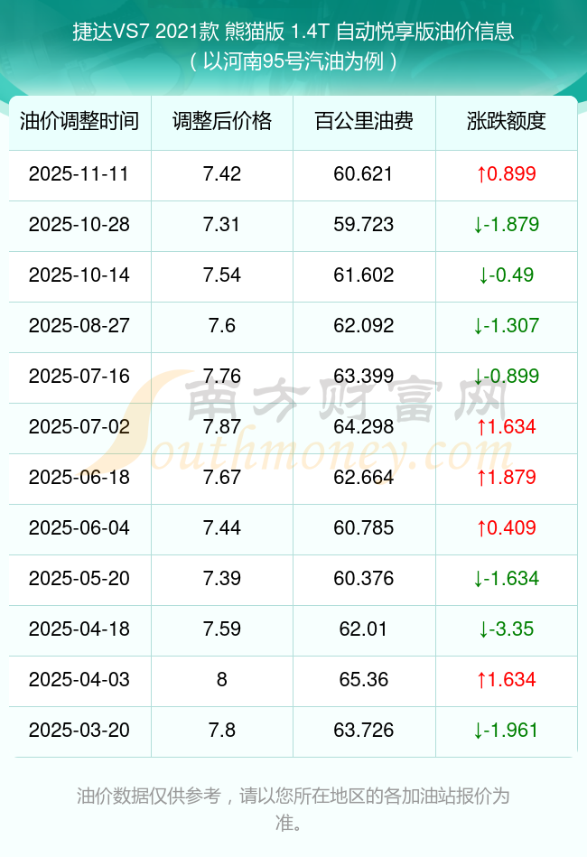 按照11月11日95號汽油最新調(diào)整價格7.42元/升來計算(以河南為例),該車型百公里平均油費(fèi)為60.621元,按照上一輪10月28日調(diào)整價格7.31元/升來計算,百公里平均油費(fèi)為59.723元,對比上一輪多花0.899元,下一輪油價調(diào)整時間為11月24日24時。