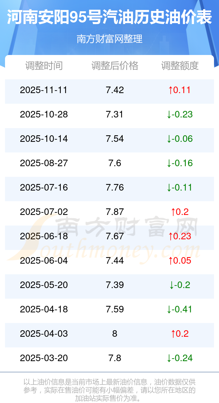 2025年95號(hào)汽油價(jià)格調(diào)整一覽表