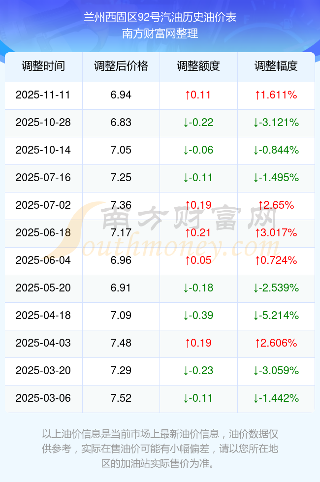 蘭州西固區(qū)92號汽油11月16日最新價格為6.94元/升,為11月11日油價調(diào)整后的價格,相對上次調(diào)整時間10月28日的油價6.83元每升,上漲了0.11元,上漲1.611%。