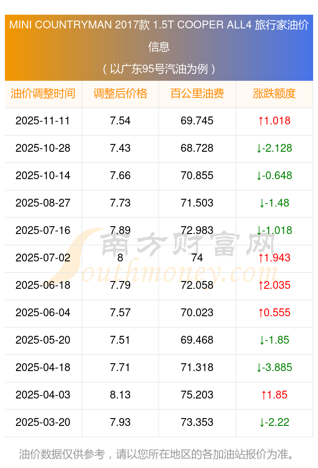 按照11月11日95號汽油最新調(diào)整價格7.54元/升來計算(以廣東為例),該車型百公里平均油費(fèi)為69.745元,按照上一輪10月28日調(diào)整價格7.43元/升來計算,百公里平均油費(fèi)為68.728元,對比上一輪多花1.018元,下一輪油價調(diào)整時間為11月24日24時。