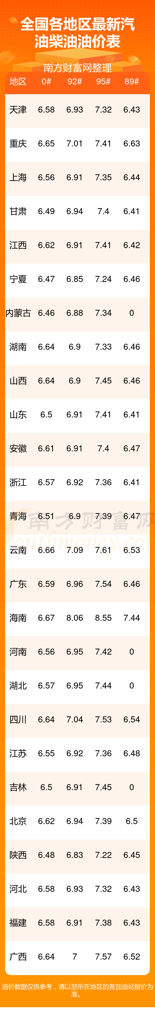 以上數(shù)據(jù)僅供參考,請(qǐng)以您所在地區(qū)的加油站實(shí)際售價(jià)為準(zhǔn)。南方財(cái)富網(wǎng)發(fā)布此信息的目的在于傳播更多信息,對(duì)使用該油價(jià)信息所導(dǎo)致的結(jié)果概不承擔(dān)責(zé)任。