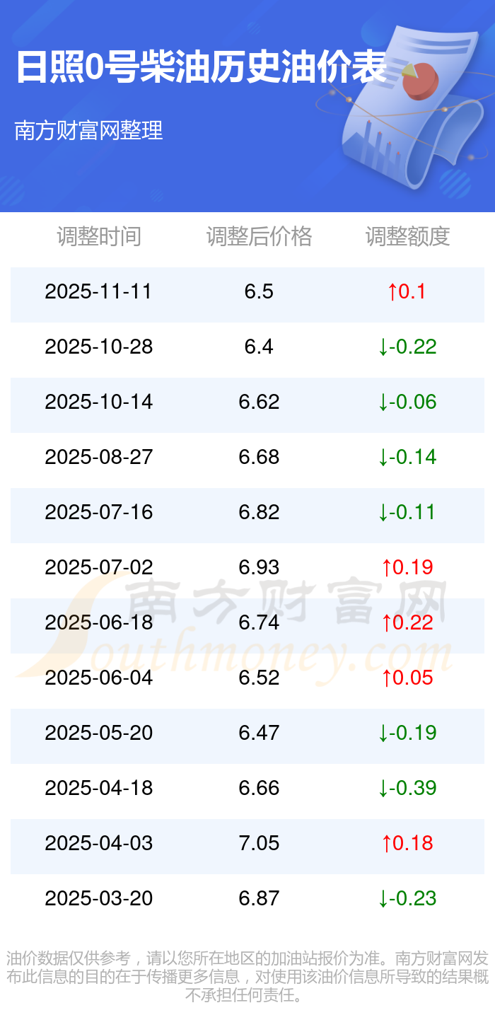 11月16日日照0號(hào)柴油的價(jià)格為6.5元/升,這是11月11日調(diào)整后的價(jià)格,對(duì)比上輪調(diào)整上調(diào)了0.1元,上調(diào)1.563%。