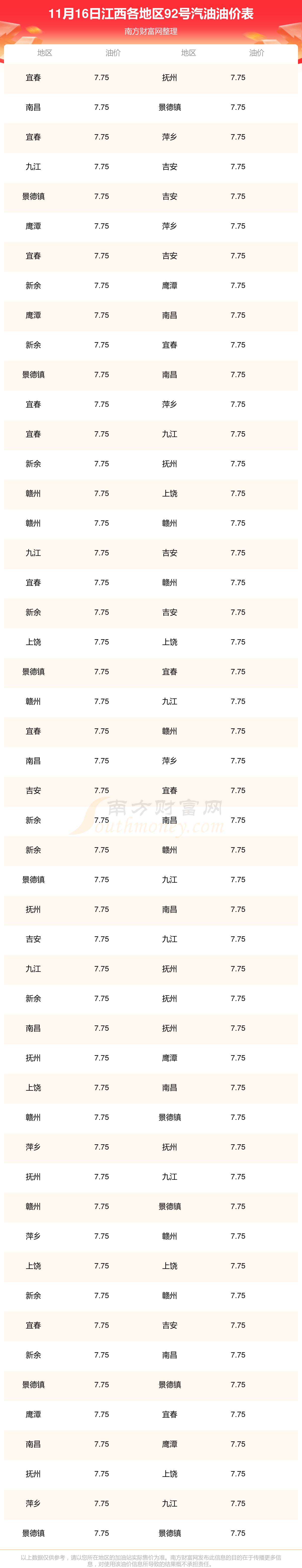 2025年11月16日江西92號汽油最新價格一覽表