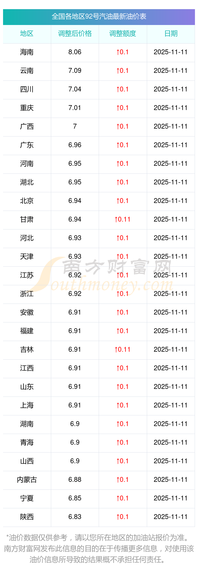 11月16日全國92號汽油最新平均價(jià)格為7元每升(本次油價(jià)格調(diào)整時(shí)間11月11日),其中,全國92號汽油最低為陜西,價(jià)格6.83元/升,92號汽油最高為海南,價(jià)格8.06元/升。