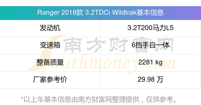 Ranger 2018款 3.2TDCi Wildtrak動力上配備的是一臺3.2T200馬力L5渦輪增壓發(fā)動機,匹配的是6擋手自一體自動檔變速箱,燃料形式為柴油,常規(guī)整備質(zhì)量2281kg,廠家參考價29.98萬元。