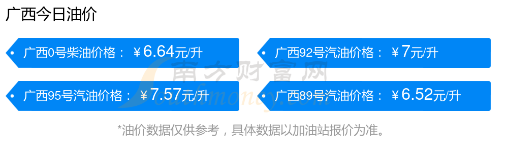 廣西靖西汽油、柴油11月16日每升的價(jià)格(油價(jià)調(diào)整時(shí)間11月11日):92號(hào)汽油7元;95號(hào)汽油7.57元;89號(hào)汽油6.52元;0號(hào)柴油6.64元。