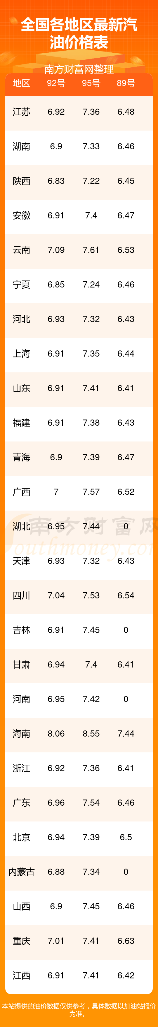 油價調(diào)整最新消息:本次油價的調(diào)整時間為11月11日,調(diào)整后全國92號汽油平均價格為7元每升,其中,最低的是陜西,6.83元每升,最高的是海南,8.06元每升。全國95號汽油平均價格為7元每升,其中,最低的是陜西,7.22元每升,最高的是海南,8.55元每升。全國0號柴油平均價格為:7元每升,其中,最低的是內(nèi)蒙古,6.46元每升,最高的是海南,6.67元每升。全國89號汽油平均價格為7元每升,其中,最低的是浙江,6.41元每升,最高的是海南,7.44元每升。下一輪汽油價格調(diào)整時間11月24日24時,距離現(xiàn)在還有8.39天。
